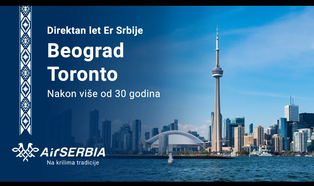 Er Srbija sa zadovoljstvom najavljuje uspostavljanje direktnih letova između Beograda i Toronta (aerodrom Toronto Pirson YYZ), počevši od 23. maja 2026. godine. Ova ruta predstavlja jedan od najznačajnijih etapa razvoja Er Srbije u novijoj istoriji i od izuzetnog je značaja za putnike, turizam i privredu. Letovi između Beograda i Toronta će se realizovati dva puta nedeljno, i to sredom i subotom, avionima erbas A330 – 200. Avio-karte su u prodaji od 16. oktobra 2025. godine i biće dostupne za kupovinu putem zvaničnog sajta www.airserbia.com, kontakt centra i svih prodajnih mesta Er Srbije.