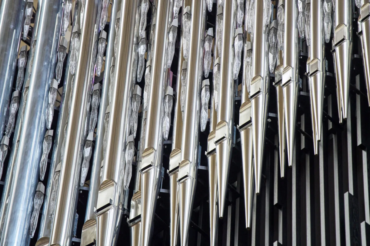 Minimalistički koncept orgulja čini da najveće fasadne cevi izgledaju kao da slobodno lebde u prostoru. Među njima su okačeni kristalni elementi čiji vertikalni, kristalni oblik crpi inspiraciju – između ostalog – iz bazaltnih formacija zimi. Češki proizvođači stakla u staklari LASVIT Ajeto, koja se nalazi na severu Češke, izrađuju ove komponente.